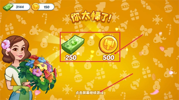 4、通关后可获得【250-钞票】和【500-金币】的奖励,此时点击屏幕即可继续游戏,积累资源用于后续关卡。