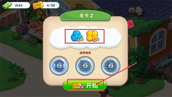 是一款曾与ROVIO合作的MYBO团队打造的爆款消除经营作品,凭借颠覆式玩法与优质制作风靡欧美后登陆中国,以“拯救破败花店”为核心主线,融合点消闯关与店铺改造。玩家将在充满温馨氛围的奥哈娜岛,通过指尖消除积累星星,修复店铺、解锁装饰,还能参与节日活动、与好友协作,在浪漫剧情与趣味玩法中,感受解压休闲与经营成就的双重体验。1、进入【关卡2】需达成【蓝色花-x20】和【黄色花-x20】的消除目标,道具暂未解锁,点击带【FREE】标识的【开始】按钮进入关卡。