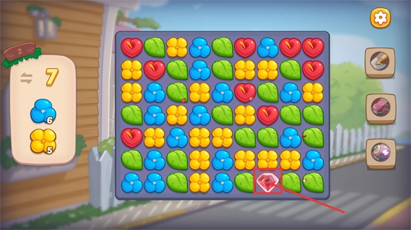 3、剩余【7-步数】时,继续聚焦【蓝色花-6】和【黄色花-5】的消除任务,点击界面中的【红色钻石】可触发范围消除效果。