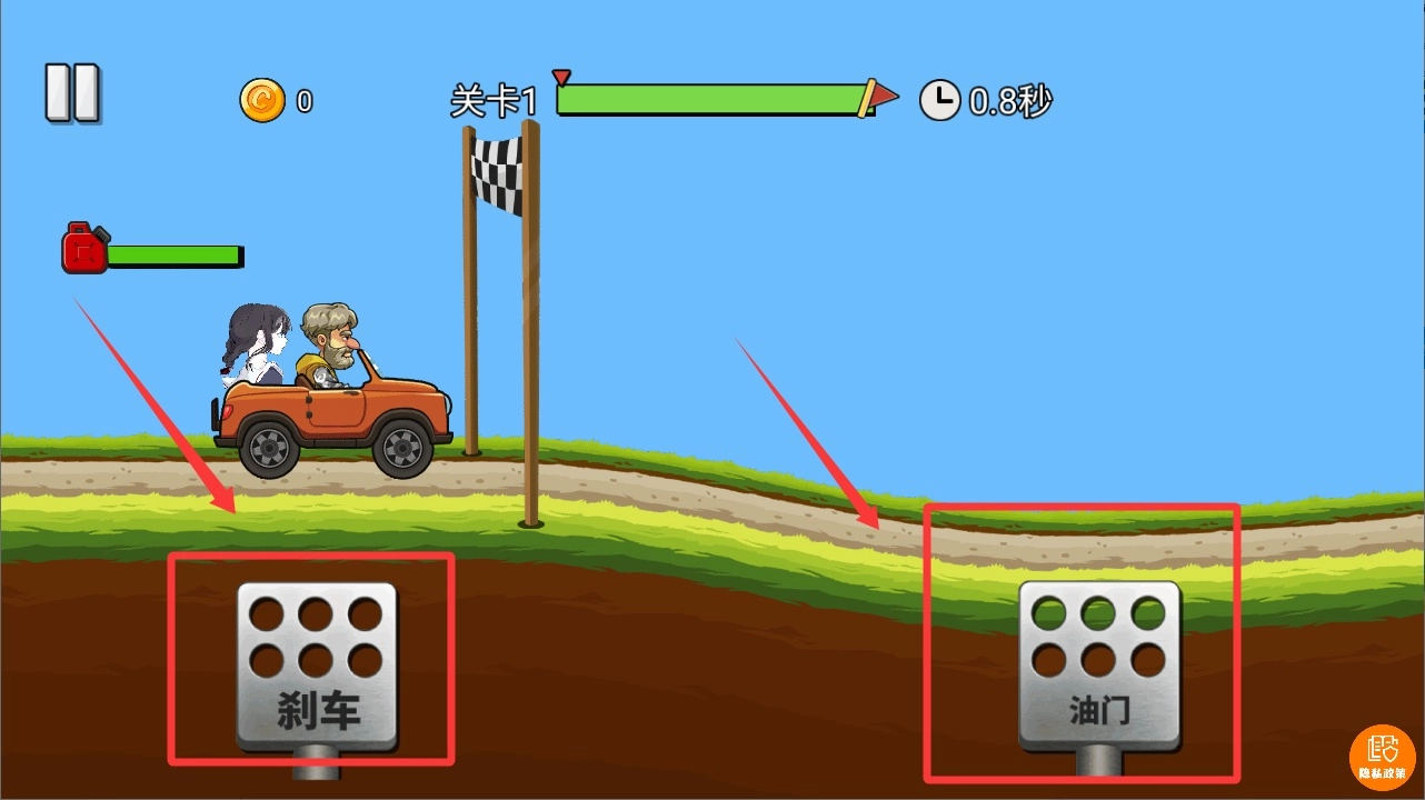 左边的红色踏板是制动控制键,右边的绿色踏板用于加速,点击油门就能让车辆前进。