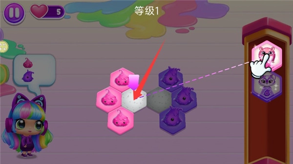 4、玩法十分简单,只需将右手边的方块拖动到对应颜色的盒子里,当同一颜色的方块集齐三个时,就能触发消除效果。