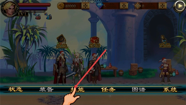 2、底部设有状态、装备、技能、任务、图谱以及系统等功能板块。