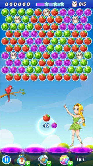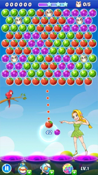 1、核心玩法为泡泡消除,通过滑动瞄准、松手发射,让同色泡泡匹配消除,清空屏幕即可通关。