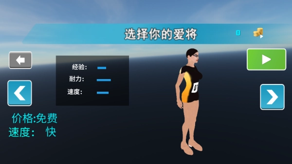 2、从可选运动员中挑选心仪爱将,查看其速度、耐力等属性,点击右上角绿色按钮确认选择。