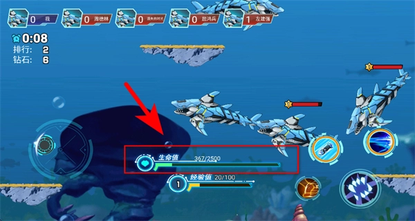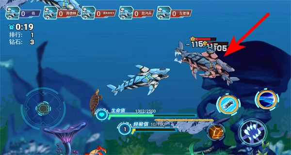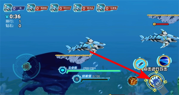 2、持续点击攻击按钮,对敌方的机器鲨鱼造成伤害,通过击败对手来推进自身的对战进度。