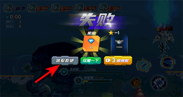 4、要是对局没能获胜,就点击战役拒绝按钮,重新开启一局新的对战,继续参与对抗机器鲨鱼的玩法。