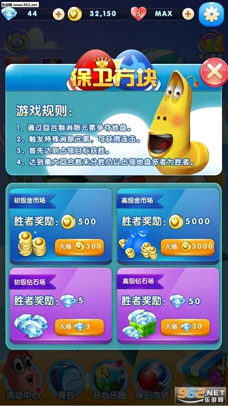 的通病。《爆笑虫子之爱消除》针对这个问题,专门设计了回合制的保卫方块模式。这个模式包含4个不同的场次,按照消耗资源的差异,分为初级金币场、高级金币场、初级钻石场和高级钻石场。不同场次对应的占领目标方块数量有所区别,具体为30个、40个、50个和60个。只要比对手先达成该场次对应的目标,就能赢得当前战斗的胜利;若达到最大回合数仍未分出胜负,则以占领方块数量更多的一方为胜。