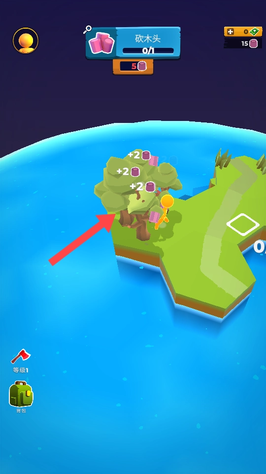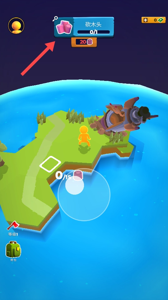 1、进入游戏后优先查看【砍木头】任务,操控角色在岛上寻找树木进行砍伐收集资源。