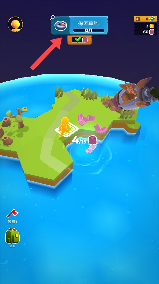3、完成【砍木头】任务后,关注新任务【探索草地】,操控角色前往草地指定区域完成探索。