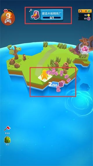 3、在【建造木板精炼厂】任务区域,收集材料直至进度达【2/50】,逐步达成建造条件。