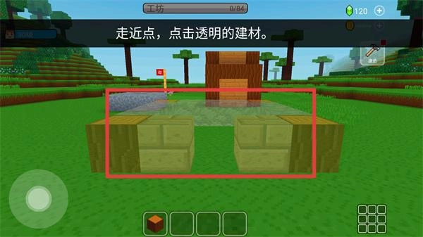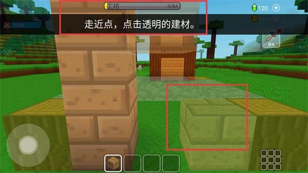 2、接取【工坊】的建造任务后,靠近目标区域,点击【透明的建材】即可推进建筑搭建进度。