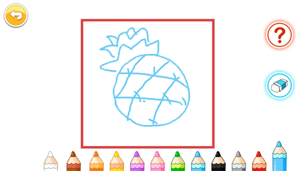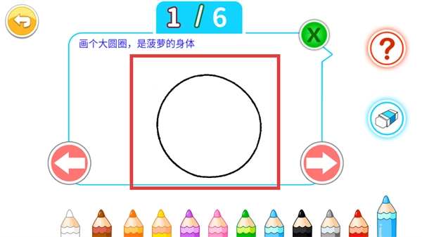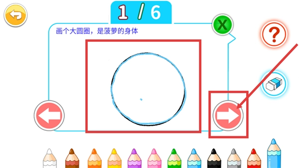 2、进入关卡后看提示【画个大圆圈是菠萝的身体】,先选合适颜色的画笔,在框内画大圆圈哦。