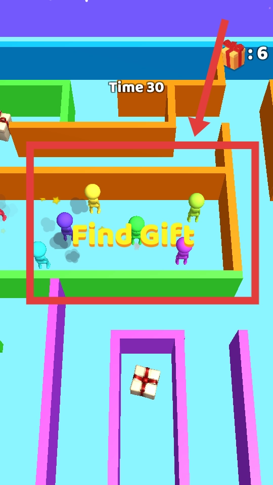 进入游戏场景后,操控角色在彩色迷宫区域移动,寻找标有“找礼物”字样区域里的礼物,注意上方的时间限制,要在30秒内完成任务。