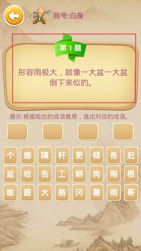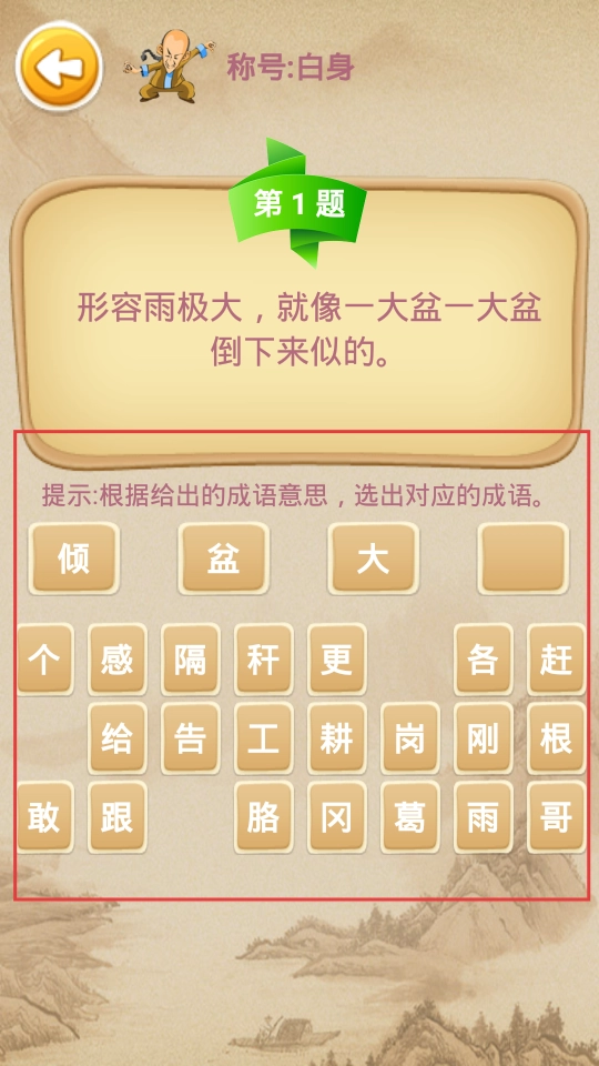 按照题目给出的成语释义,从下方的汉字里挑选合适的字,依照顺序点击组合成相应的成语,以此通过当前关卡。