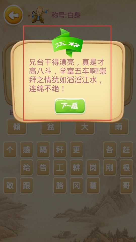 成功答对题目后,点击下一题按钮,就能进入新关卡,挑战不同成语释义的解谜任务。