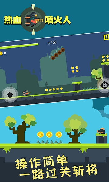 《热血喷火人》是一款十分有趣的闯关游戏,它的上手门槛不算高。玩家要操控角色在关卡里不断前进,得巧妙避开前方的各种障碍物,朝着更远的距离冲刺。这款游戏对玩家的反应速度可是不小的考验呢。