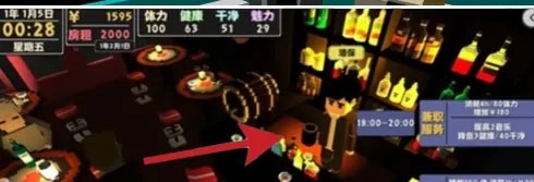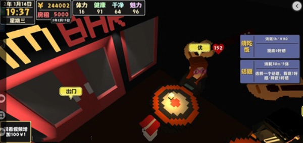 第四种方法是,点击游戏界面里的“出门”选项,然后在地点中选择酒吧,这样就能前往酒吧做兼职了,每次打工能挣到180元。