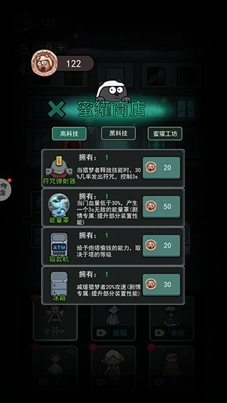 点击右上角的蜜獾商店,在里面持续提升自身属性,这样玩家下次游戏时就能获得额外的攻击和防御加成,从而更轻松地应对猛鬼的攻击。