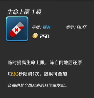 效果:能临时提升生命上限,角色阵亡倒地后该效果便会还原;初始等级状态下,每90秒仅可购买1次,且效果支持叠加。