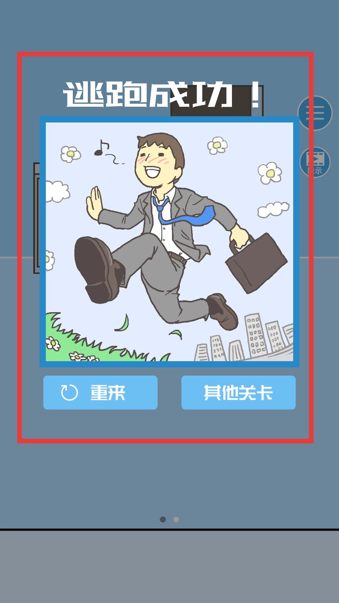 成功从办公室逃脱后,会弹出逃脱成功的界面,界面上展示着角色逃离后的愉悦画面,同时设有重来和其他关卡的按钮。点击其他关卡按钮,就能挑战新的关卡,继续重复探索、解谜与逃脱的流程。
