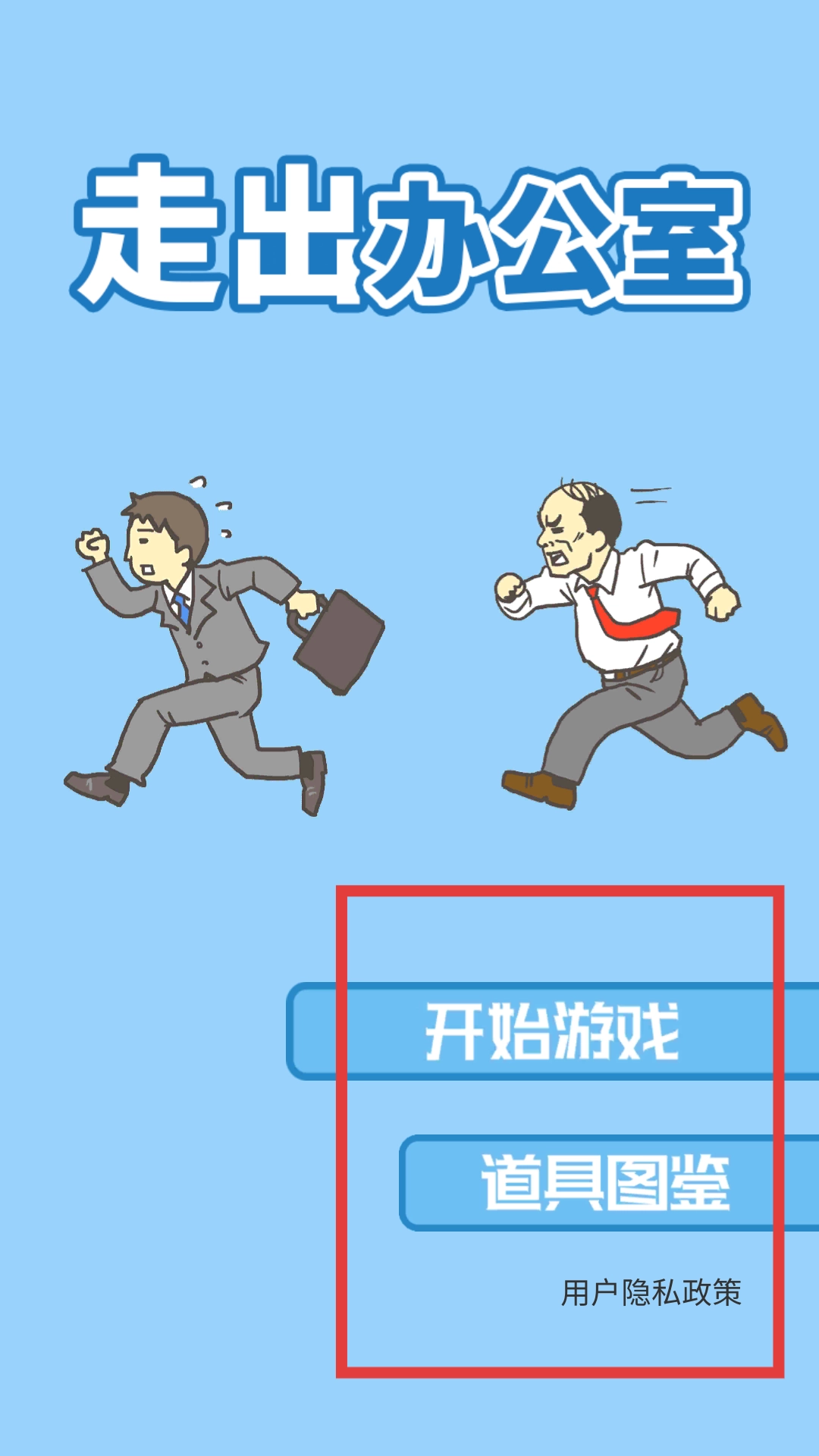 打开《逃出公司大作战》进入初始界面,界面上有开始游戏、道具图鉴两个按钮,还显示着用户隐私政策;点击开始游戏按钮后,即可进入游戏场景。