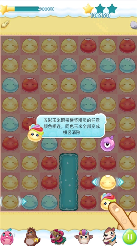 五彩玉米与带有横竖精灵的任意颜色相连时,所有同色玉米都会触发横竖消除效果。