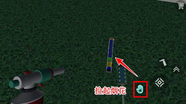3、进入地图后,现在正式给大家介绍烟花模拟器的按键功能:屏幕左侧用于移动,右侧的按钮能实现捡起烟花、摆放烟花、拿出点火器点火以及跳跃等操作,此外还有右上角的烟花商店按钮。