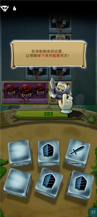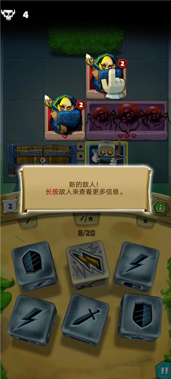 14、长按骰子并拖拽到目标位置即可释放技能;回合结束时,所有骰子都会获得一点充能,中间列的骰子还会通过掷出的每个闪电图标和星星图标额外充能;