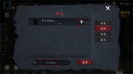 2、进入多人界面后,找到并点击“添加”按钮,接着在下方的搜索框内输入好友姓名开展搜索,待搜索到目标好友后,点击其对应的“+”图标完成添加操作。