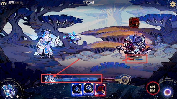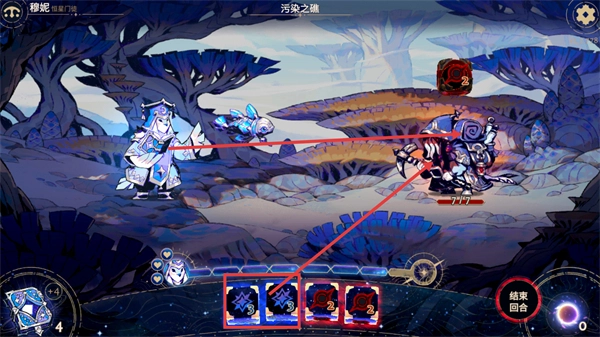 在【污染之礁】场景里,操控角色【穆妮-恒星门链】,运用带有【3】点伤害的卡牌,对当前生命值为【7/7】的敌方单位发起攻击。