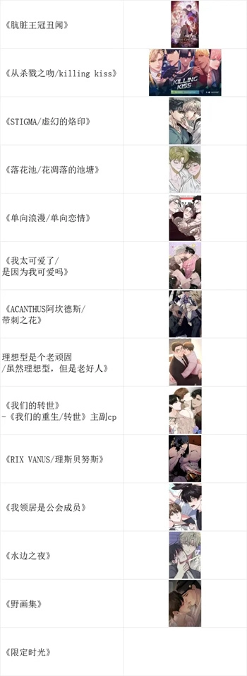 目前联动作品包括《肮脏王冠丑闻》《从杀戮之吻/killing kiss》《STIGMA/虚幻的烙印》《落花池/花凋落的池塘》《单向浪漫/单向恋情》《因为我太可爱了/是因为我可爱吗》《ACANTHUS阿坎德斯/带刺之花》《理想型是个老顽固/虽然理想型,但是老好人》《我们的转世》(又名《我们的重生/转世》)《RIX VANUS/理斯贝努斯》《我邻居是公会成员》《水边之夜》《野画集》《限定时光》。