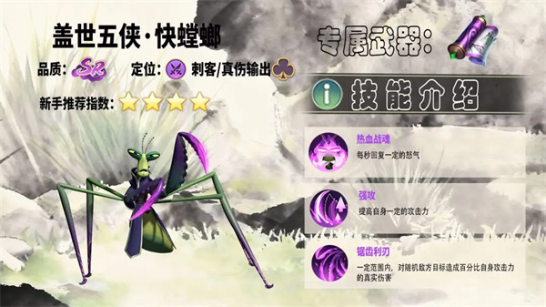 2、角色作用:盖世五侠·快螳螂是新手前期极为推荐的优选C位,在PVE中伤害表现突出,配合“3激励2铁壁”羁绊,队伍整体坦度与输出兼备,开局怒气获取迅速,前期推图流畅无阻。该阵容角色可通过前期新手轻松获取,还有就是快螳螂虽然爆发力极强,但生存能力较弱,需依赖团队保护。其兼具真伤机制,实际强度远超当前品质,既是前中期PVP的利器,也是推进副本的关键角色。在前期关卡中堪称“后排杀手”,能有效克制高威胁目标。