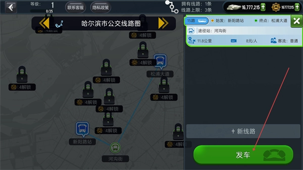 1、在哈尔滨市公交线路图选新线路,确定途径路和乘客数,点击发车开启公交任务。