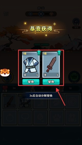 2、获取到【1级-血-6】【1级-攻-6】,点击替换即可提升战力,让后续战斗能力得到增强。