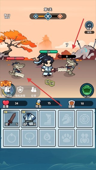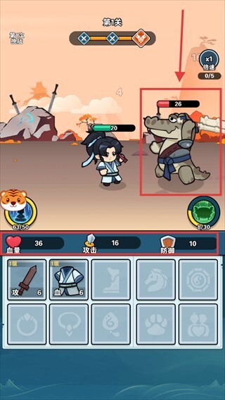 1、进入关卡后会自动战斗,装备【攻-5】【血-4】可以提升属性,通过应对鳄鱼怪来积累经验。