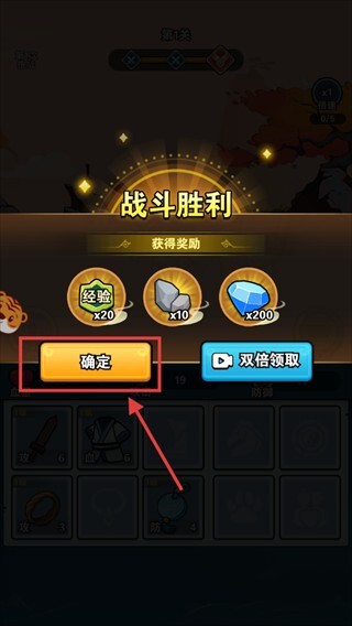4、战斗胜利后点击【确定】按钮,即可领取【经验×20】【石头×10】【钻石×200】的奖励,通过积累这些资源来提升角色能力。
