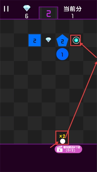 2、聚焦【2】方块弹射弹珠来累积分数,借助【x2】道具放大收益,同时瞄准【+】按钮获取额外增益,以此提升【当前分-1】。