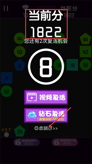 4、当分数达到【当前分-1822】时,若挑战失败可选择【视频复活】继续游戏,钻石不足的情况下会优先采用免费复活方式,同时保留当前的高分进度。