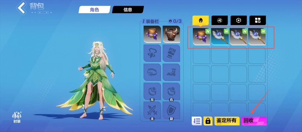 3、背包里多余的装备别留着,点击【回收】按钮,既能腾出背包空间,还能获取相应资源。