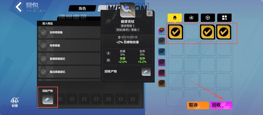 4、回收装备时,要先确认清楚打算回收的物品,像【萌芽灵杖】这类装备都在此列,再次点击【回收】按钮后就能获取对应的产物,这对积累资源是很有帮助的。