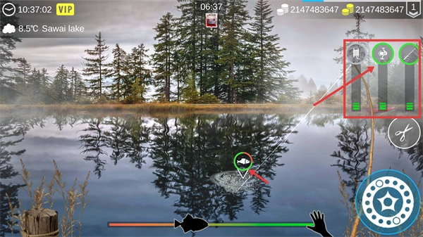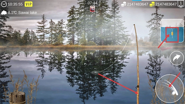 当浮漂产生异常动态时,借助界面右侧的鱼竿操作按钮来完成咬钩阶段的互动操作,从而触发鱼进入咬钩状态。