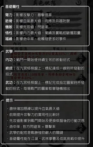 3. 出色的战斗机制:战斗系统由井字棋优化而来,上手简单但精通不易。玩家借助连接OX图形来释放外功招式,战斗时要依据局势变动做出攻防选择,并且得预先搭配好外功与内功,策略性极强,过程丰富多变。
