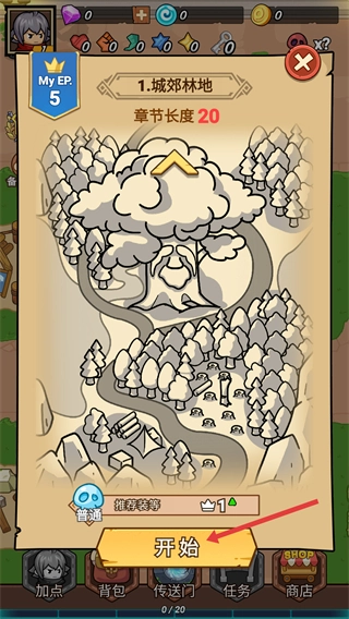 1、进入【1.城郊林地】章节(章节长度-20),点击【开始】按钮进入关卡。