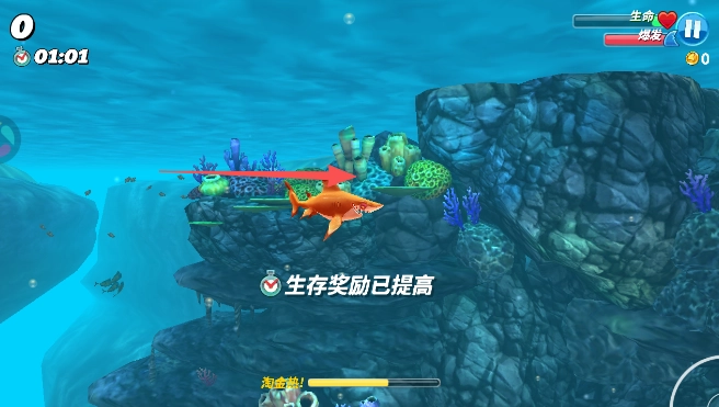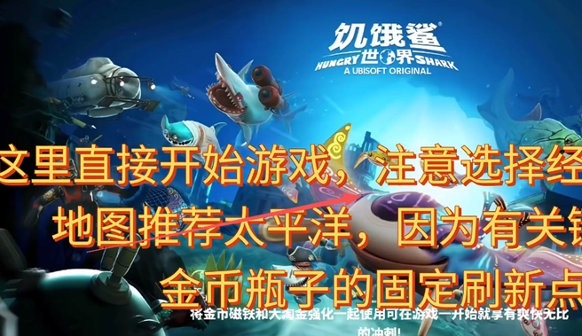 4、开局把法鲨的能量条攒满,这操作挺简单的,接着一路往右走,直接去出生点的泳池。