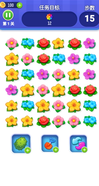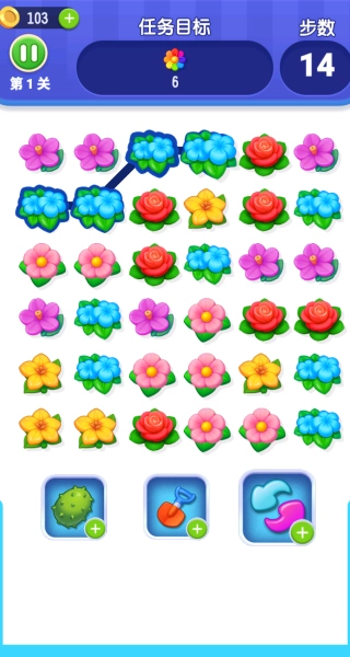 3. 每一个关卡都设有需要收集的特定鲜花数量任务,或是需要完成特殊图案的任务,只要在限定的步数之内完成这些任务,就能顺利通关。