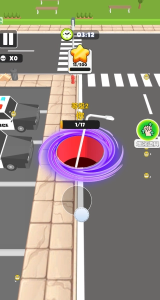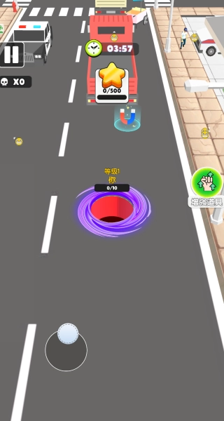 2、用虚拟摇杆操控黑洞在场景中移动,初始阶段只能吞噬路人、箱子等小型物体,积累基础成长进度。