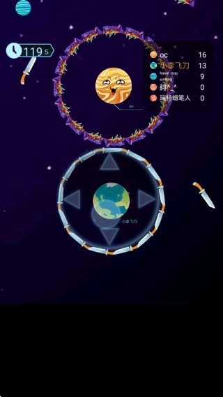 2.玩家在竞技场中操控自己的星球移动,通过收集散落在各处的飞刀来增强战力,进而逐步提升攻击范围与生存能力。