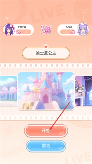 1、进入【迪士尼公主】主题对战界面,确认对手是【Anna】后,点击界面里的【开始】按钮,就能开启本次装扮对决。
