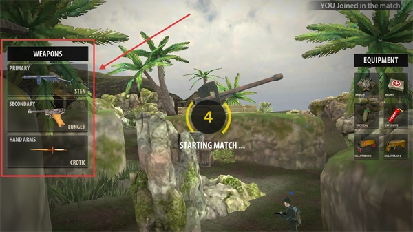 2、进入战役前,请在【WEAPONS】界面检查【PRIMARY】-【STEN】和【SECONDARY】-【LUNGER】等武器装备是否合适。