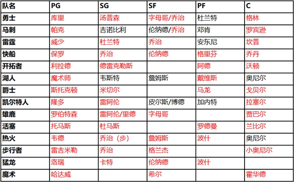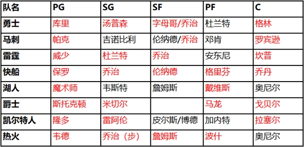 我们只保留了五人阵容里至少有三位大师级以上球员的队套,湖人的情况比较特殊所以也保留了,后面会说明原因,接下来会对球队进行进一步筛选。